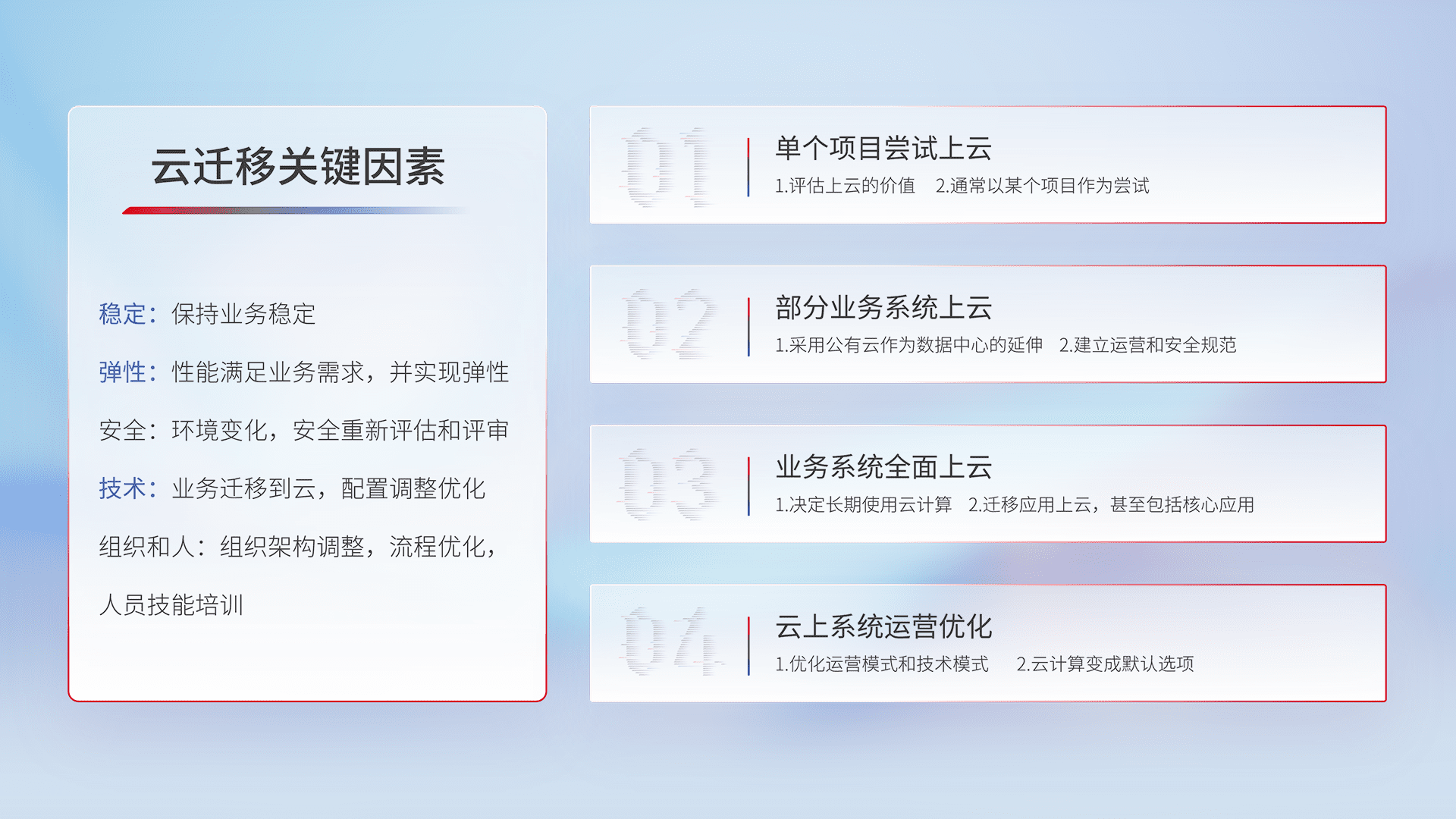 结合实际业务,,,,从规划设计、、、、云平台选型、、、、云原生改造、、、、数据迁移、、集成交付,,迁移全过程为客户识别最佳上云路径,,,,做好风险识别管理,,,设计网络架构、、身份权限、、、安全审计合规、、操作审计、、日志审计、、、监控告警策略、、、多站点容灾设计等,,对云上基础设施进行整体规划,,提升IT治理水平,,,,以满足弹性、、、高可用、、、、高性能的需求。。