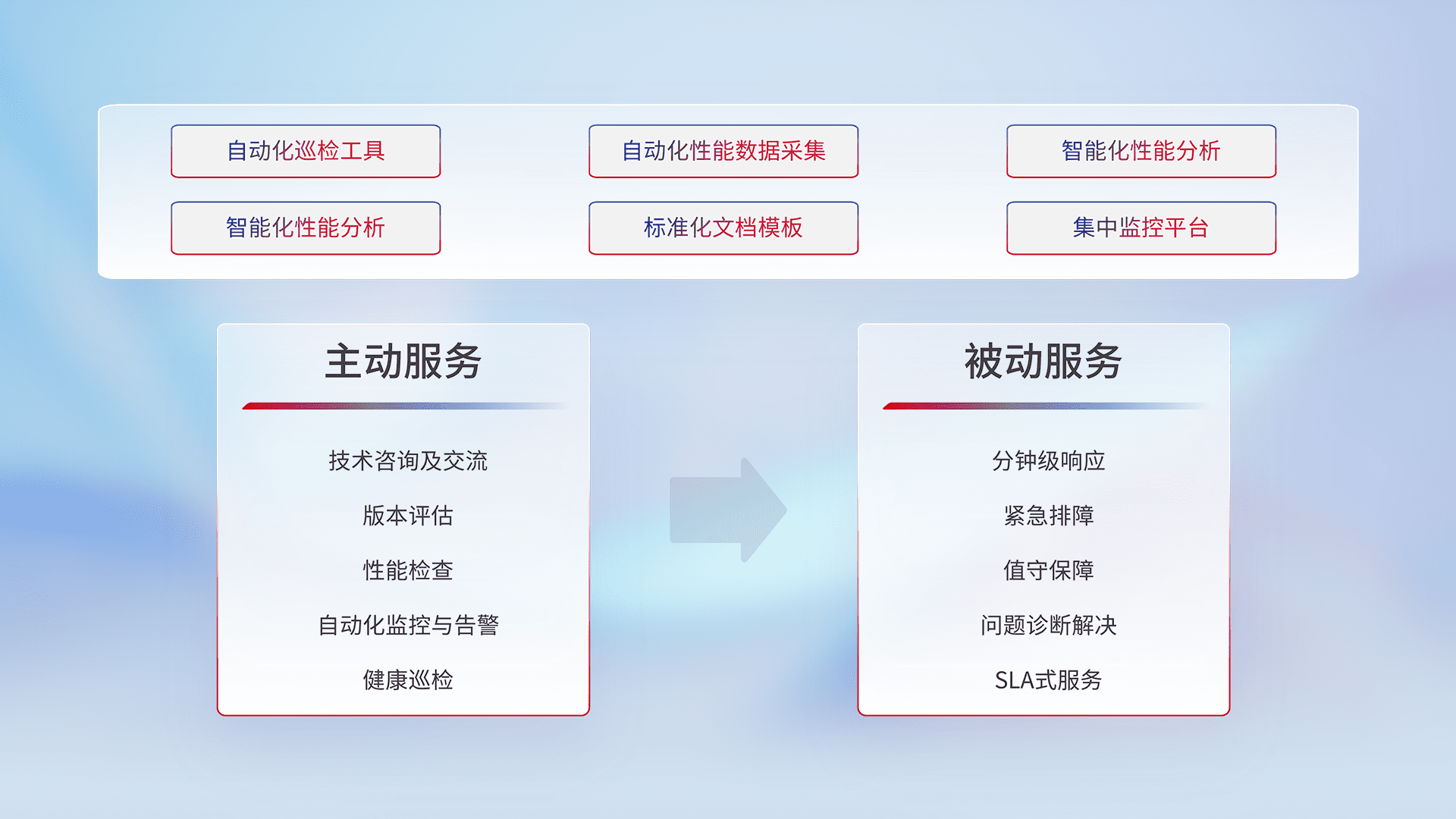 智能化工具和标准化文档,,,,保障服务质量,,,提供主动服务(包含技术咨询、、版本评估、、、、性能检查、、、、自动化监控与告警、、、健康巡检)和被动服务包含(分钟级响应、、、、紧急排障、、值守保障、、、问题诊断解决、、SLA服务)。。。